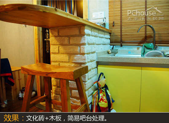 解释:开放式厨房里吧台是必须的,进门左侧就是吧台,用了间隔餐厅与厨房。吧台的设计很简易,一幢半高的墙,没有上水泥,用文化砖增强厚重感,上面搁一块木板,长度伸出一点,就成了小吧台。