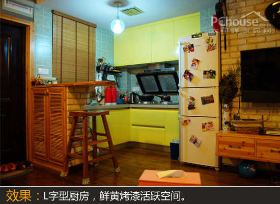 3、如果是使用原木小清新就要贯彻到底,厨房的黄色烤漆与原木小清新风格有冲突。