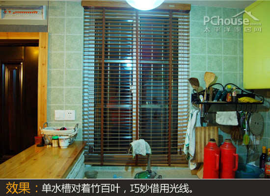 解释:橱柜的窗帘是竹百叶,豆爸的邻居做窗帘的,很实惠的价格给了他们家。豆妈的水槽选了单槽,这跟她的个人习惯有关。
