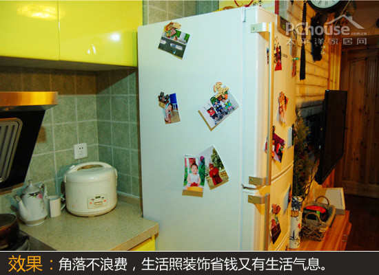 解释:冰箱处在与客厅相连的角落里,门上贴满了豆豆的生活照,一看就知道豆妈是有多爱小豆豆了。