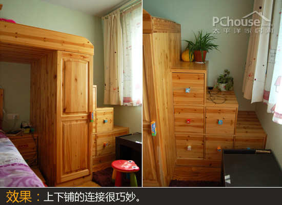 解释:上下铺由木制台阶相连,台阶上放点植物装饰,台阶空隙也利用尽了,打造了很多抽屉,抽屉纵深很长,放豆豆的玩具和衣物都行,衣柜是整个上铺的支撑,一举两得。