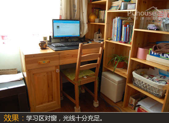 解释:正对窗户是豆豆日后的学习区,书柜贴墙,与客厅大书柜一样的设计样式,格子高低错落,房间没有油烟,不用装玻璃门。