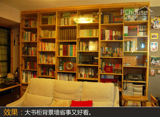 解释:开放式厨房的油烟偶尔还是会跑到客厅来,为了保护书籍,豆爸做了6片钢化玻璃门。书柜格子的高度恰好放下一本大书,顶天立地的设计让书籍尽可能多地塞了进去。