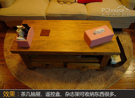 解释:榆木茶几分为中间镂空层与抽屉,茶几旁边还有杂志收纳架。茶几上淘了一个遥控收纳盒,电视机、空调之类的遥控都塞在一起,不会在桌面乱丢而显得凌乱。