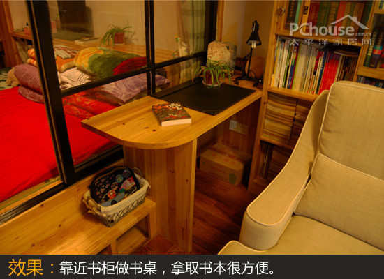 解释:沙发与书柜右侧有一个小缝隙,做了个小小的工作台,连着书柜一起形成了豆妈的灵感小天地,圆角处理考虑周全。