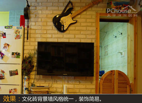 解释:电视背景墙不宽,刚好容纳一台挂墙式电视机,响应文化墙主题,不刷水泥,坚持环保而又具有厚重感。背景墙上方放一把旧吉他,吉他左侧还有一个挂钟,作装饰之用,两三件东西就把墙体装饰起来了。