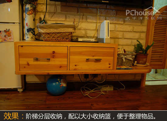 解释:电视机下方是悬挂式收纳柜,阶梯状设计不显得呆板。用上收纳盒,东西就不会显得凌乱。