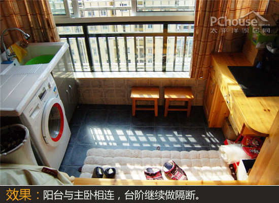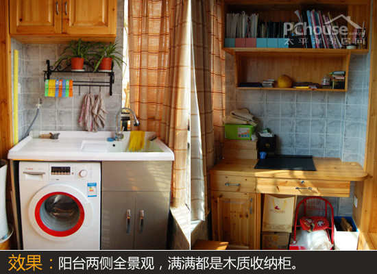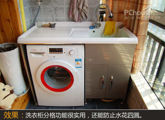 解释:阳台上面规规矩矩地做了洗衣机柜,阳台不大,使用这种滚筒洗衣机,开关处在外侧,比起掀盖式洗衣机更省空间。