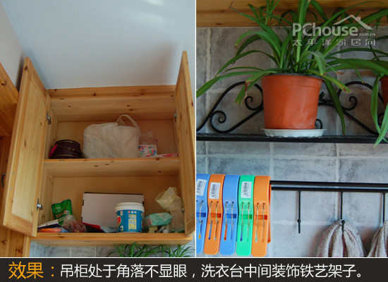 解释:洗衣柜上方有两扇门的吊柜,中间镂空带做了铁艺架子,用绿色植物装饰一下阳台,还可以挂挂毛巾与衣架子,一举两得。