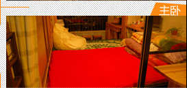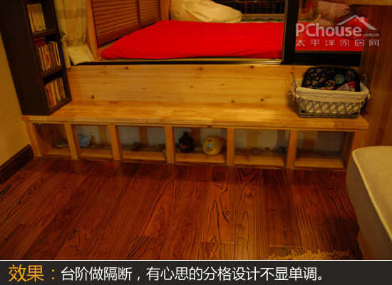 解释:主卧打造成榻榻米形式,与客厅之间的隔断是一个木质台阶,台阶镂空,等分成六格,放置一些装饰物,还弄了荧光灯带,小户型也有活力时尚。