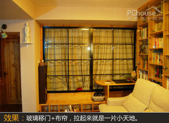 解释:主卧用了玻璃移门,带了一点点日式风格,由于移门与正门相对,为了保护隐私,布帘派上了用场,拉起来就是豆爸与豆妈的小天地。