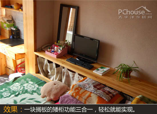 解释:榻榻米的一侧做了矮柜,充当了床头柜、电脑桌、梳妆台的多重角色。左边变成了电脑桌,拉开帘子就是电脑主机的位置。紧挨着电脑桌是豆妈的梳妆台,还有一个装着瓶瓶罐罐的收纳盒。