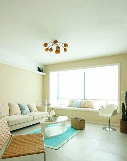 整个客厅在大大飘窗外阳光的照射下变的很通透,大理石的地砖在夏季让人看上去就特别的凉快。墙面上采用了白色和米色的搭配色,米色雅致沙发和其上淡蓝色的抱枕都让人觉得非常舒适。