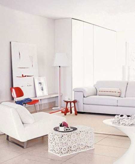 墙面和地面都是清爽的色调,但是夹杂其间的红色小板凳和椅子却给空间带来了丝丝活力感。沙发采用了舒适的布艺材质,墙面上的搁架和收纳柜都提供了很好的储藏空间。大概是多种色彩搭配的缘故,整个空间看上去带着淡淡的粉色感。