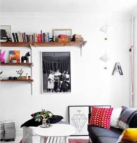 客厅的墙面、沙发和门都是纯粹的白色,因此其间的书柜以及地板就搭配了深色的木制地板,这样有深有浅的设计比纯白色多了不少质感以及视觉上的层次感。沙发一旁的银色钓鱼灯很好玩。