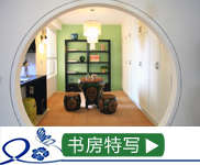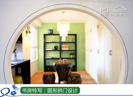 书房特写:书房采用了半开放式设计,用圆形拱门与外界做了一个分割,非常有创意,而且充满了中式风情的味道。