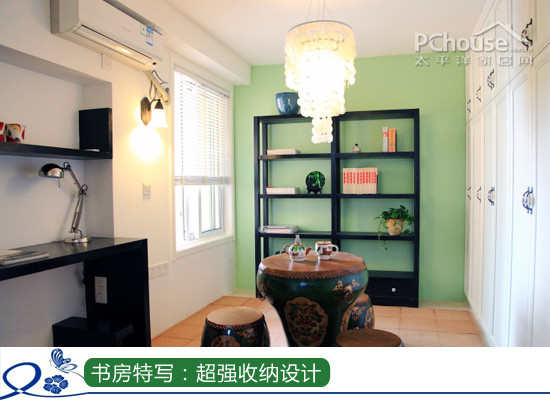 书房特写:进入书房,地面做了柜子抬高处理,可以储存很多物品,也可以兼做客房。墙面做了挖空处理,拉长了柜子与办公桌之间的距离,使书房有更多的活动空间。书柜所摆放的那面墙做成了绿色,为书房增添了更多的活力。