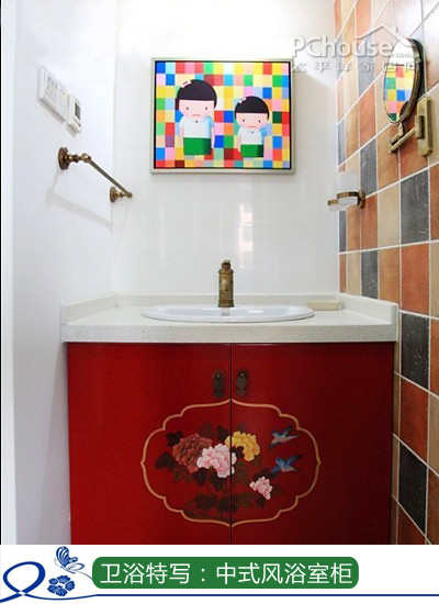 卫浴特写:鞋柜的后面就是卫生间,浴室柜柜面采用了大红色,搭配中式风格画,非常抢眼,而墙面又挂了一幅充满童真的色彩鲜艳的现代挂画,混搭出了别样风情。