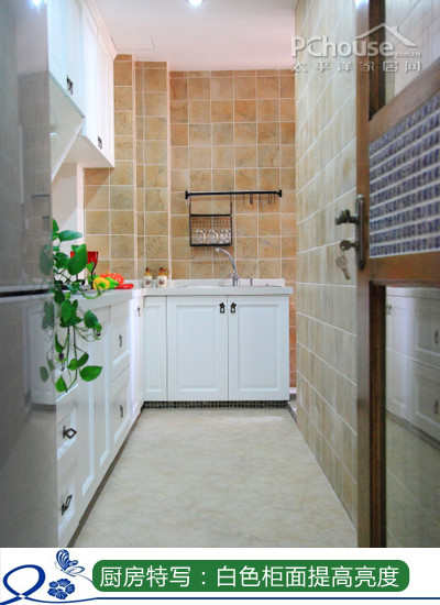 厨房特写:厨房很小,而且采光也不好,所以柜面采用了白色,以此来提高亮度。