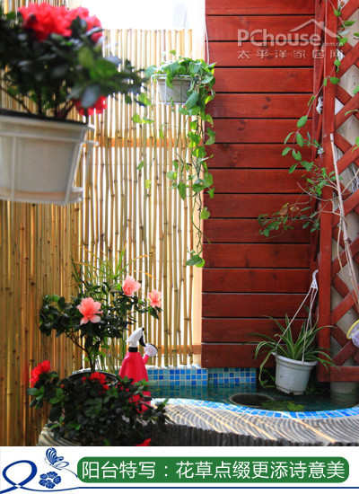 阳台特写:客厅的外面的就是阳台,木质的围栏将阳台包围起来,通风采光都很好,花草的点缀使阳台更添诗意的美感。