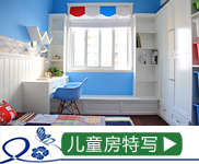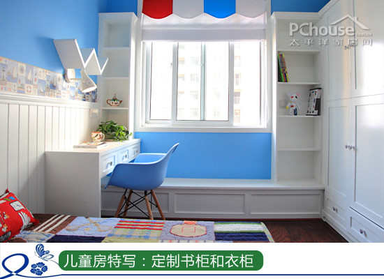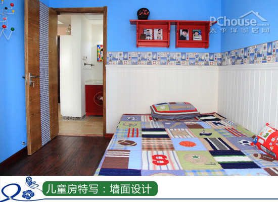 儿童房特写:除了房门保持了中式风格以外,儿童房又是一番天地,其整体的风格非常明快,以蓝和白为主色调,床边白色是护墙板,能保护墙壁也有美化作用。