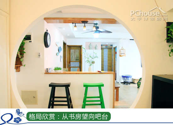 格局欣赏:从餐厅一眼看过去,就是吧台和书房了,餐厅和书房之间用吧台做了一个隔断,同时书房采用圆形拱门的设计,颇为一种中式庭院的感觉,小户型竟能营造出如此大气之感!