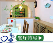 格局欣赏:从吧台处看客餐厅全景,就像是欣赏一幅现代中式画,色彩鲜艳,看似杂乱无章,但更体现了居家的随意和温情。客餐厅采用开放式设计,使空间显得更开阔,对于小户型来说,非常适合。