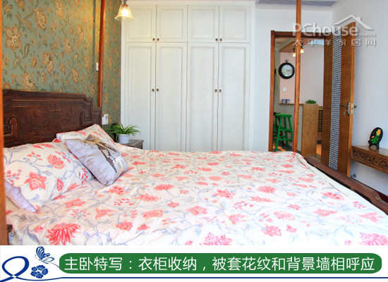 主卧特写:卧室的床头背景墙选用的壁纸图案和床上四件套相呼应,花团锦簇,美不胜收。定制的白色到顶衣柜加强了卧室的收纳,床边四根木棍是为了夏天的时候方便挂蚊帐。