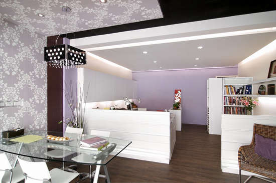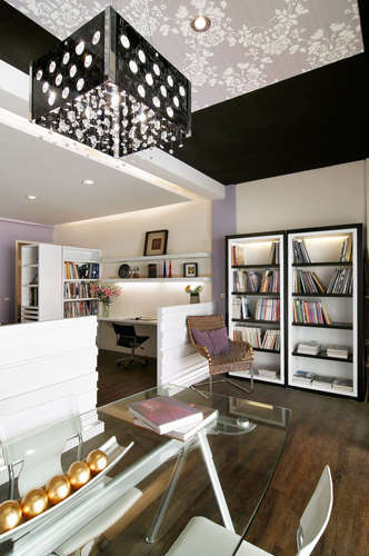 编辑推荐:接待区域的书柜以黑色木皮做边框的修饰,搭配白色的背景,共同诠释出优雅古典的时尚之于视觉的意象表现。
