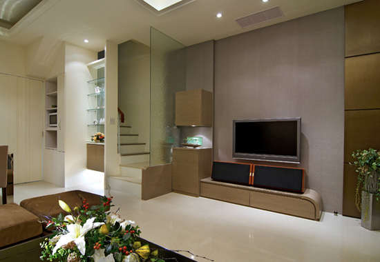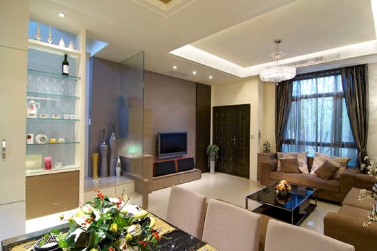 编辑推荐:主墙不以等比例的立面造型做切割,同时因与客厅之间的界定有限,故TV柜体改以弧线收边,将进门第一印象设定为圆融、和谐、减少压迫感,以木作造型将电器箱、视听电器机组隐藏收纳于其间。