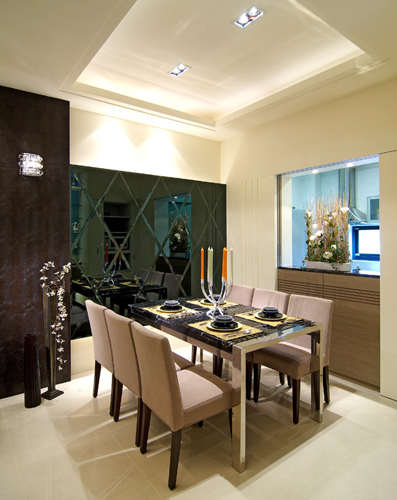 编辑推荐:厨房之间以隐藏式吧台做为区域间彼此界定的因子,墨镜做菱格状的比例切割,完整的呈现出低调奢华的时尚感。