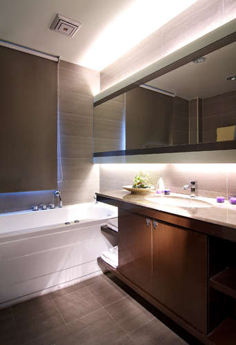 编辑推荐:以加长的镜箱设计配置间接光源,木作与石材的相互搭配,围塑出自然而具空间上的延伸向度。