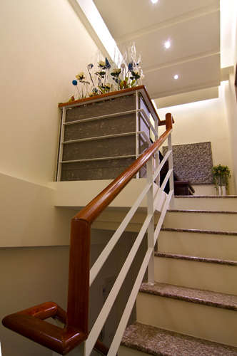 编辑推荐:设计师利用清玻璃做隔屏,利落的掩蔽从入口处直视楼梯的视觉,展示柜的设计接续至楼梯下方的二个踏阶,同时顺利的将楼梯动线作转向设计。