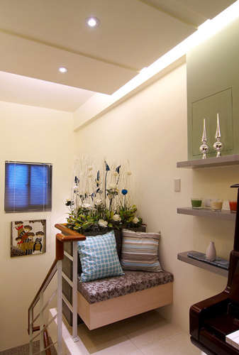 编辑推荐:利用楼梯旁的区域,辅以绿色植栽的铺排,木作座椅的设置,让此一空间显得舒适而悠闲。