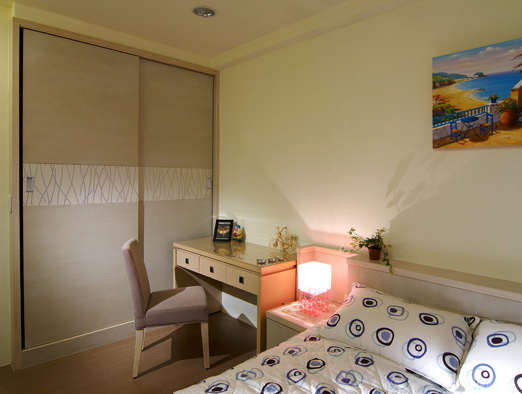编辑推荐:床头以白橡木安排,衣柜门片为了日后方便业主作空间的变幻使用,于是以壁纸取代木皮,重伸复古浪漫氛围。