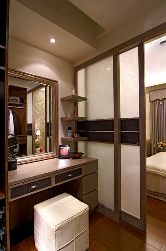 编辑推荐:以柚木地板接续与主卧间的地域关系,推拉门扉以木作为框架,搭配皮革做门片上的腰带处理,透过夹纱玻璃,光影更为充裕而自由穿越。