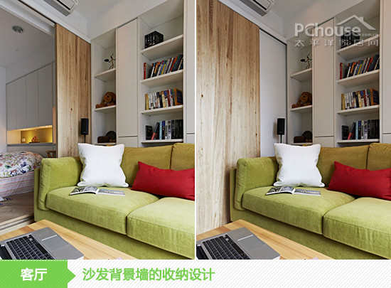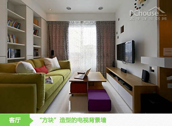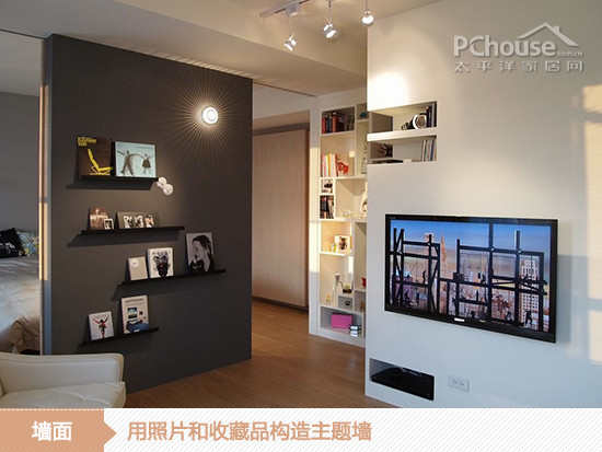 电视背景墙施作入凹槽,减化了转折的锐利度,一旁简单的书柜墙,除了书籍摆放,更是夫妻俩收藏生活记忆的美好天地。