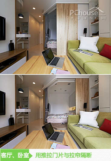 主卧房前的推拉式门片分隔开客厅和卧室,也将公私领域做了灵活的分野。