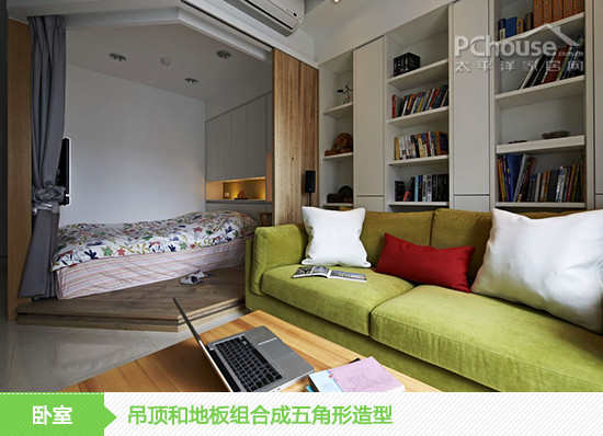 五角形的睡眠空间,吊顶及架高的地板互相呼应,形成的造型在视觉上产生强烈的冲击。