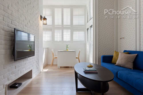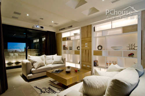 天花板的部分,不作一般的包覆处理,以立体斜角方式,巧妙隐藏视听设备于无形。
