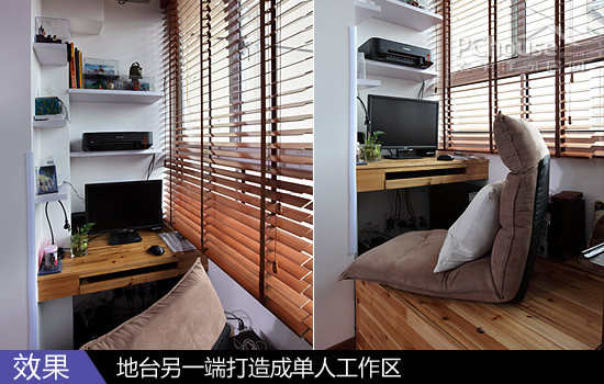 空间利用:地台的另一端光线也很充足,打造成工作区。小小的工作区只靠简单的几块搁板构成,搁板高低错落,整个空间仅仅能放置一台电脑,只容单一个人工作。平时工作较忙的只有爸爸COLIN,所以这个角落就成了他的专属天地。木百叶窗的设计,方便调节工作时的光线。另外,地台正上方就是JOJO家晾衣服的地方,没有阳台只能迁就着使用了。