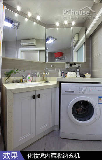 空间利用:往右边看,定制的石制台面分为高低层,高层凸出的高度刚好足够放进洗衣机,把最小的一面墙用完了,贴合得很完美,高层台面可以放电器类用品,防止被水花溅湿。低层设计成下凹式水槽,也是防止水花四溅的贴心考虑,此外,米色台盆加点黑色点缀,耐看耐脏。化妆镜还内藏玄机,打开是一个收纳柜,JOJO建议使用阻尼铰链可以防止关门时伤到镜子。