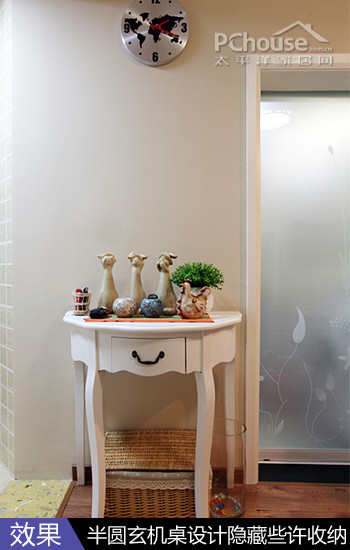 收纳设计:定做的玄关桌大小刚好和这面不规则墙面一样,从桌面,小抽屉到桌底收纳篮,分成三种不同类型的收纳,最上层放展示品,小抽屉放日常生活小品,最下层用收纳篮保持整洁。荷叶边的桌沿设计,加以曲线形的四个桌脚,有柔和的美,白色的漆面让其看上去与墙面融为一体。