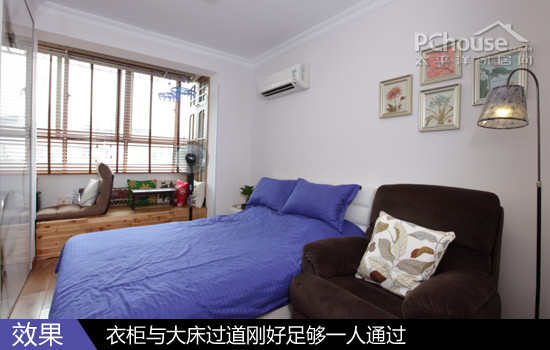 空间利用:进门右侧是紫色条纹的主卧大床,与衣柜之间有33公分的距离,足够一个人走过。角落里设置了休闲沙发,挂画加上一支落地灯,JOJO的确是在忙碌中也不忘给自己一点休闲的空间。