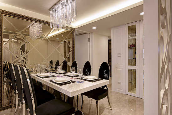 编辑点评:使用茶镜菱形切割作为主墙面,透过外围的线板框饰出浓郁古典味,营造出优雅精致的就餐气氛。