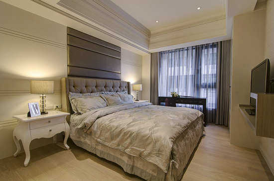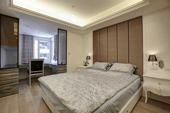 编辑点评:喜爱看电视的屋主,设计师于主卧房特别增加床尾卧榻,调整视觉距离也更舒适。