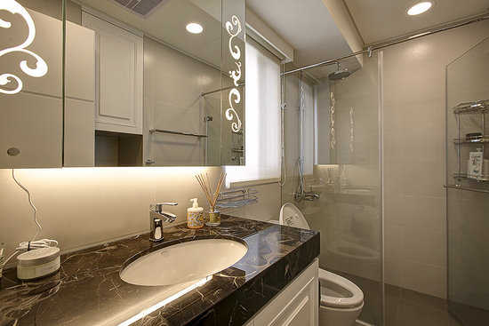 编辑点评:镜柜暗藏照明设备,在明镜上浮现出华丽图腾,平添小空间的精致感。