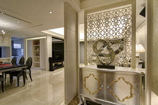 编辑点评:玄关所采用的白色锻铁的端景看来就像蕾丝一般,舒适一进门的心情。