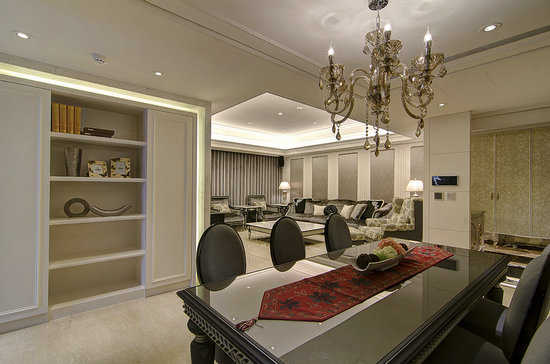 编辑点评:餐厅收纳柜与安定面结合设计,以线条比例分割,选用一盏精致的水晶灯就能凸显整场质感。餐厅天花板因有梁柱高度略低,设计师包覆同时隐藏梁位及空调主机。