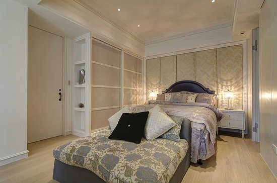 编辑点评:搭以对称的床头柜、壁灯,延续白色古典的优雅氛围。以白色营造素雅大方的卧房质感,床尾一路隐藏衣物柜、化妆桌,实现美感与机能并存的期待。